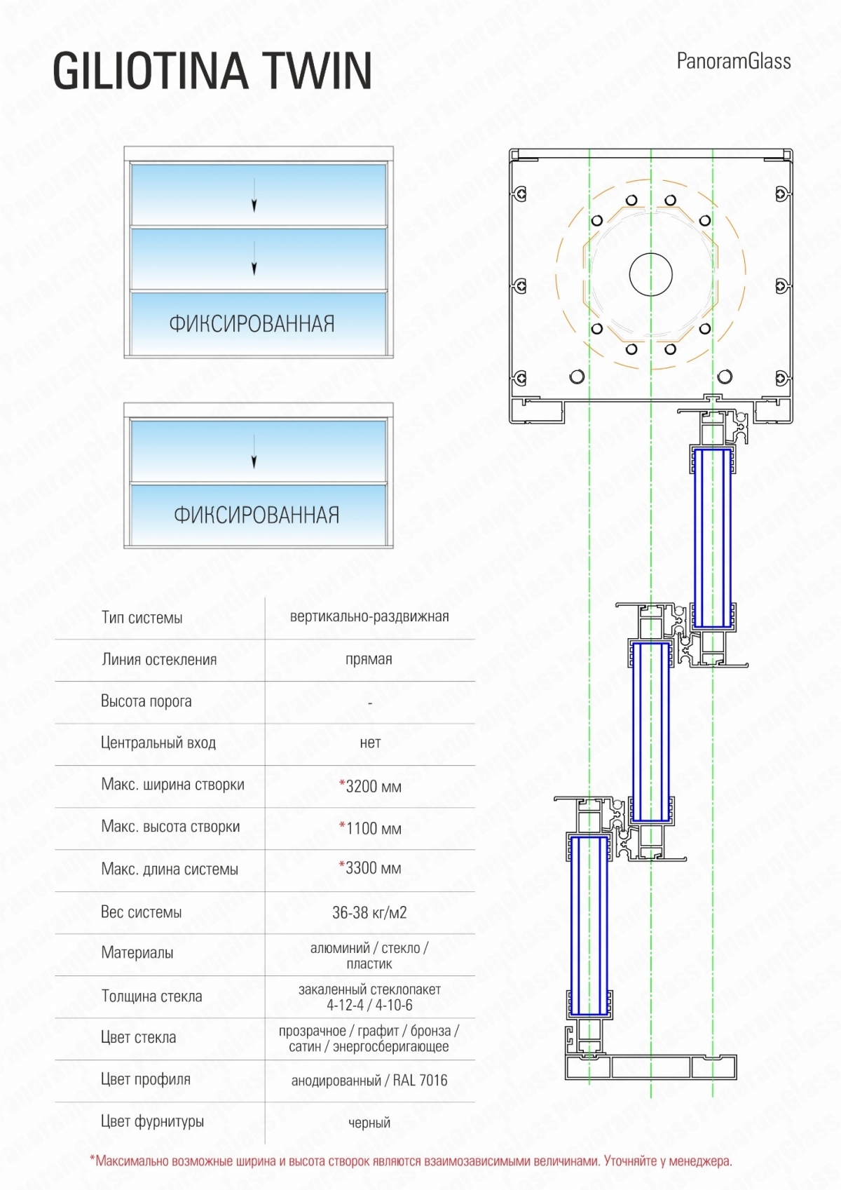 Вертикально-сдвижная автоматическая система GILIOTINA TWIN под стеклопакет 4-12-4 / 4-10-6 представляет собой систему, в которой стеклянные панели передвигаются в вертикальной плоскости проема при помощи встроенного электропривода.